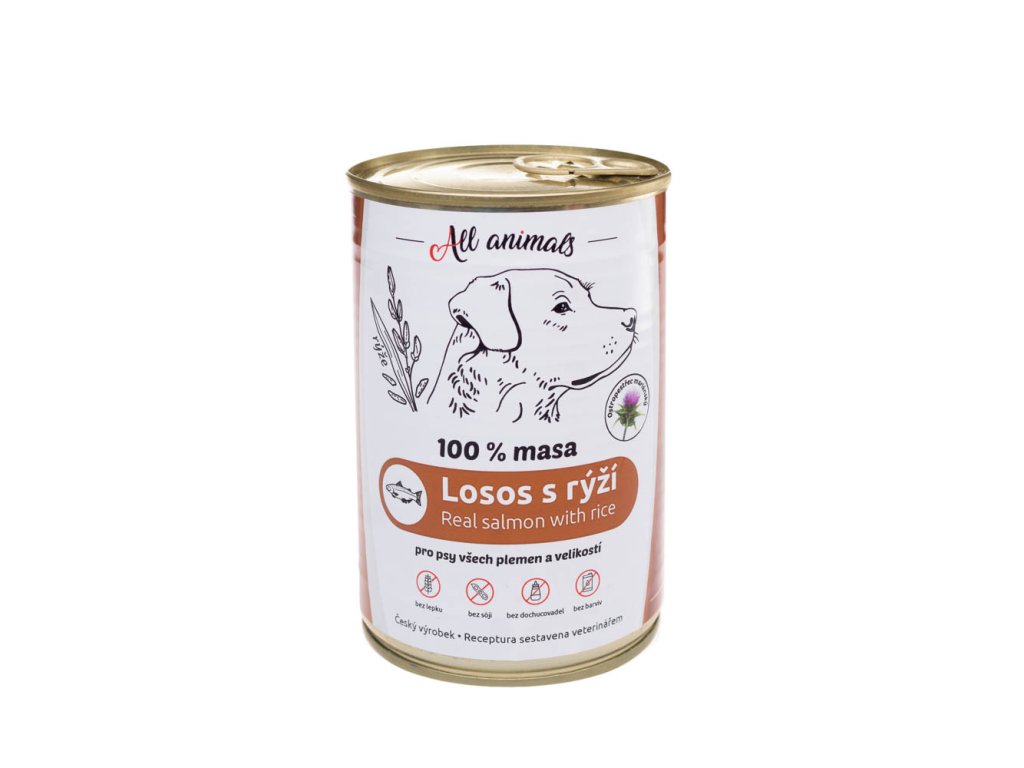 Luxusní 100% masová konzerva pro psy, s příchutí mletého lososa s rýží.