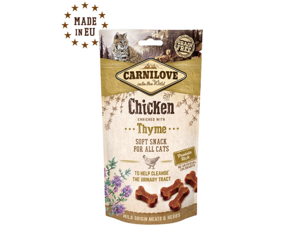 Poloměkký pamlsek pro kočky s kuřetem a tymiánem obohaceno o lesní ovoce a byliny.