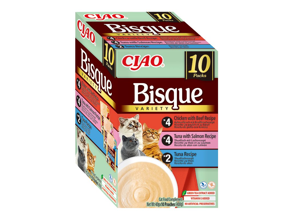 CIAO BISQUE Multipack obsahuje 10 lahodných krémových pamlsků s obsahem masa z tuňáka,lososa, kuřete a hovězího. Pečlivě vybrané suroviny a přísně kontrolovaná čerstvost. Vaše kočka si bude užívat lákavé aroma a neodolatelnou chuť při každém otevření kapsičky! Vyrobeno z tuňáka uloveného v moři. Žádné obiloviny, konzervanty ani umělá barviva. Vysoký obsah vody, který je prospěšný pro celkové zdraví koček. Nízký obsah kalorií.