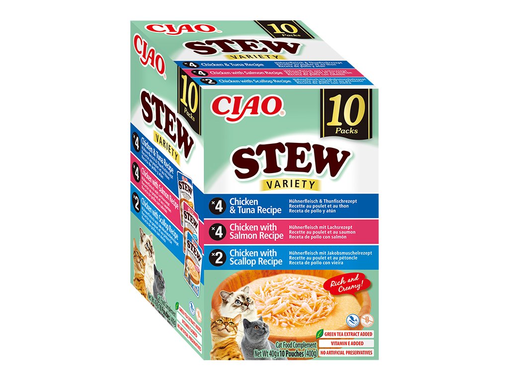 Ciao STEW Multipack obsahuje 10 kapsiček trhaného kuřecího masa v lahodném krémovém vývaru v různých variantách. Pečlivě vybrané suroviny a přísně kontrolovaná čerstvost. Vaše kočka si bude užívat lákavou vůni a neodolatelnou chuť při každém otevření kapsičky! Vyrobeno ze 100% čistého kuřecího prsa a mořského tuňáka. Žádné obiloviny, konzervanty ani umělé barviva. Vysoký obsah vody, který je prospěšný pro celkové zdraví koček. Nízký obsah kalorií.
