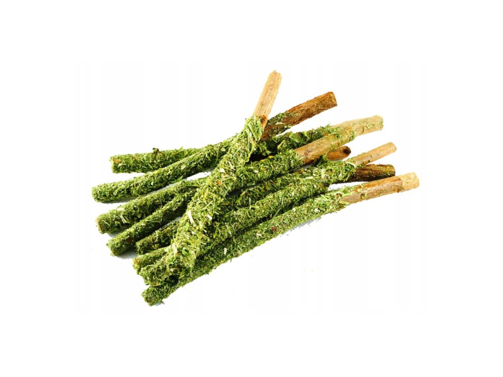 Lískové větvičky pro hlodavce s petrželovou natí. Lískové dřevo je nejen vhodným materiálem pro broušení zubů hlodavců a králíků. Poskytuje také cenné mikroelementy a minerály obsažené především v kůře lísky.