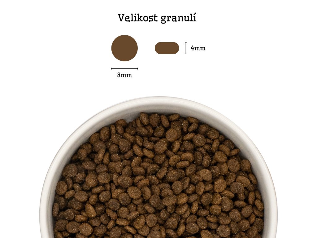 Receptura je doplněna o prebiotika MOS & FOS, omega 3 mastné kyseliny pro zdravou kůži a srst a přirozeně konzervovaná rozmarýnem.