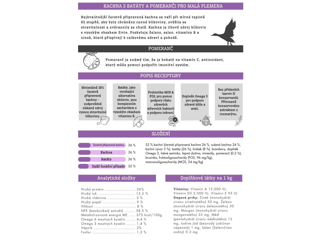 Složení: 50 % kachní (čerstvě připravená kachna 28 %, sušená kachna 20 %, kachní vývar 2 %), batáty (26 %), hrášek (6 %), brambory, doplněk Omega 3, lněné semínko, řepná dužina, minerály, pomeranč (0,3 %), brusinka, fruktooligosacharidy (FOS, 96 mg/kg), mannanoligosacharidy (MOS, 24 mg/kg)