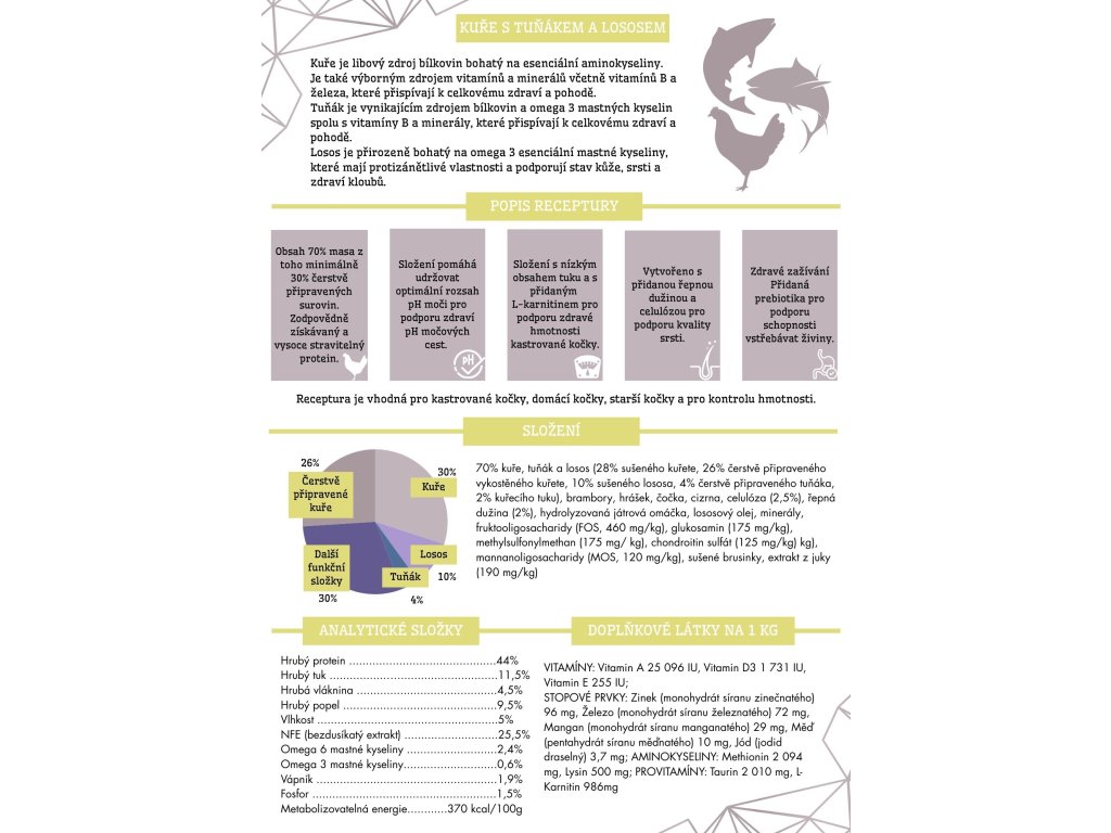 Složení: 70% kuře, tuňák a losos (28% sušeného kuřete, 26% čerstvě připraveného vykostěného kuřete, 10% sušeného lososa, 4% čerstvě připraveného tuňáka, 2% kuřecího tuku), brambory, hrášek, čočka, cizrna, celulóza (2,5%), řepná dužina (2%), hydrolyzovaná játrová omáčka, lososový olej, minerály, fruktooligosacharidy (FOS, 460 mg/kg), glukosamin (175 mg/kg), methylsulfonylmethan (175 mg/kg), chondroitin sulfát (125 mg/kg) kg), mannanoligosacharidy (MOS, 120 mg/kg), sušené brusinky, extrakt z juky (190 mg/kg)