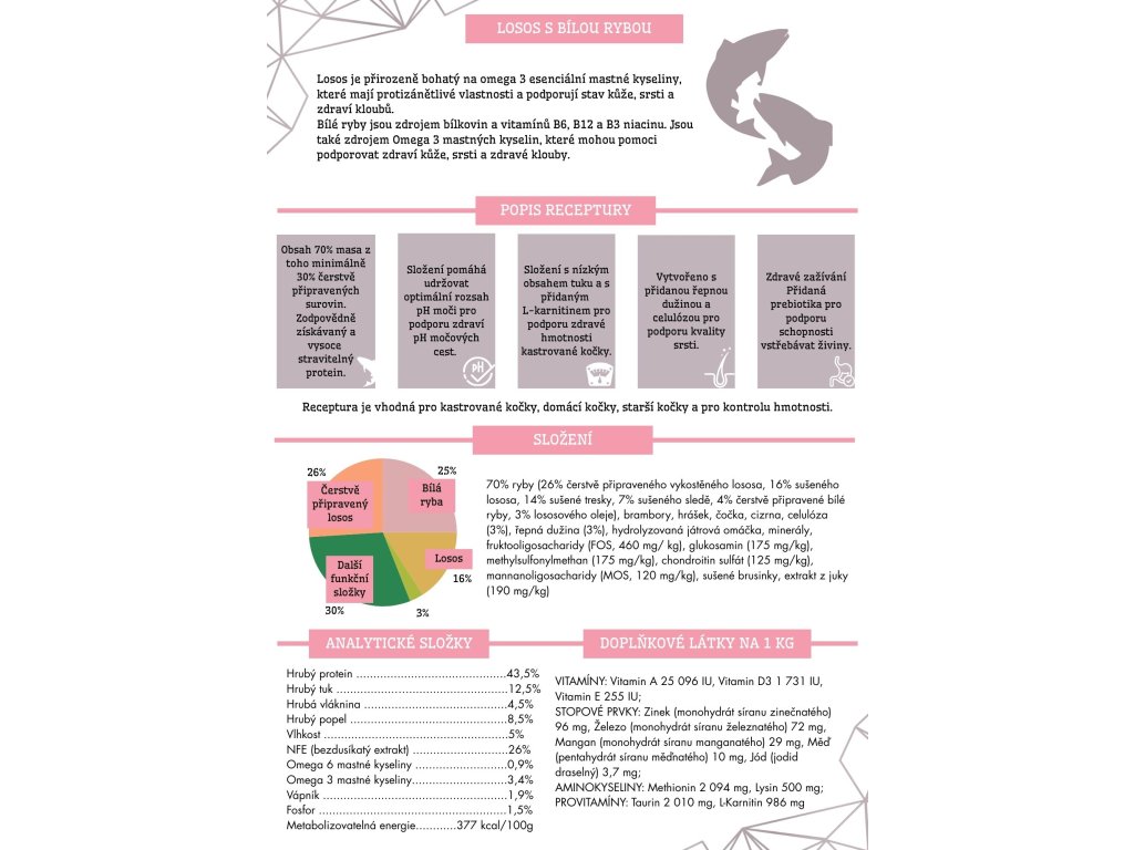 Složení: 70% ryby (26% čerstvě připraveného vykostěného lososa, 16% sušeného lososa, 14% sušené tresky, 7% sušeného sledě, 4% čerstvě připravené bílé ryby, 3% lososového oleje), brambory, hrášek, čočka, cizrna, celulóza 3%, řepná dužina 3%, hydrolyzovaná játrová omáčka, minerály, fruktooligosacharidy (FOS, 460mg/kg), glukosamin (175 mg/kg), methylsulfonylmethan (175 mg/kg), chonroitin sulfát (125mg/kg), mannanoligosacharidy (MOS, 120 mg/kg), sušené brusinky, extrakt z juky (190 mg/kg)